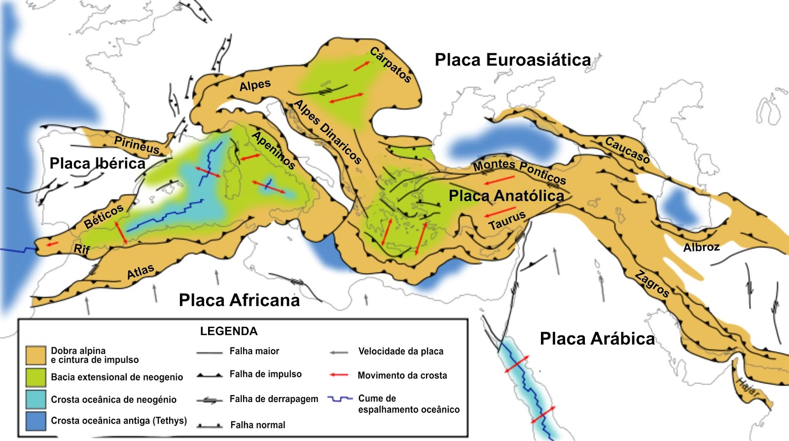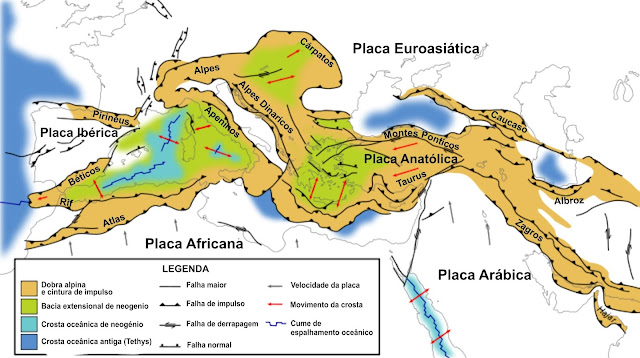 A complexidade das placas tectónicas Euroasiática e Africana na zona mediterrânica.